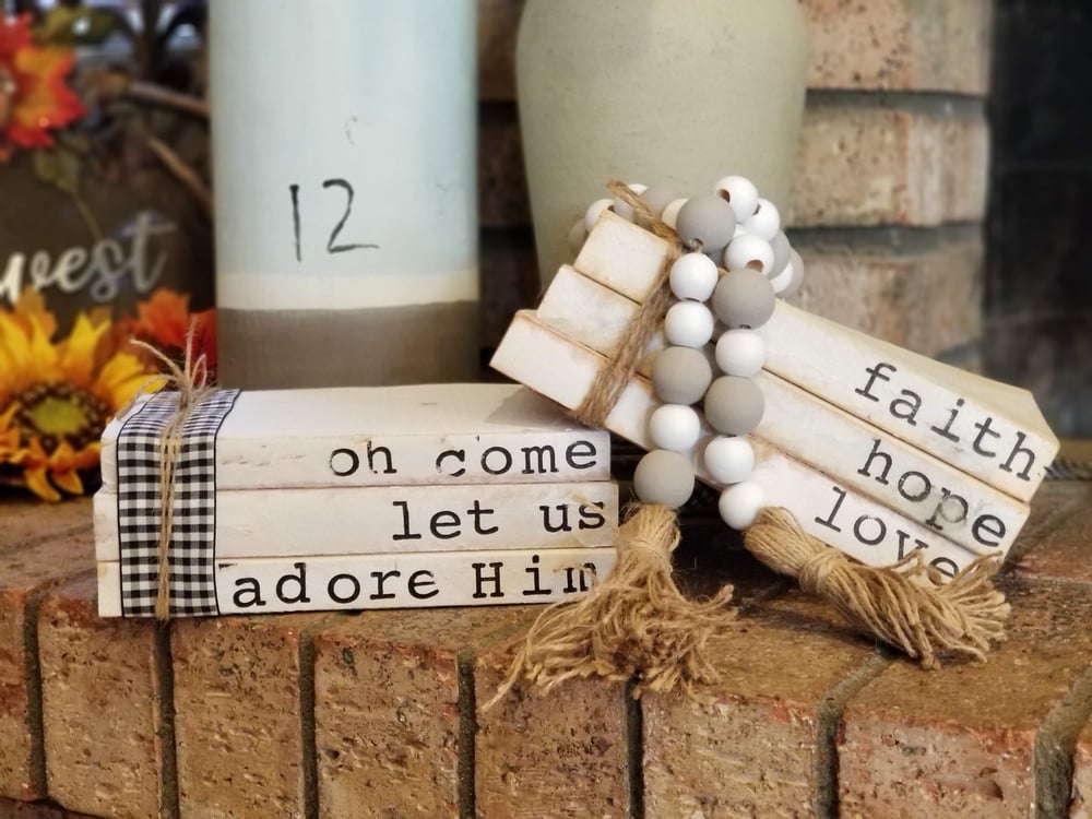 Add farmhouse rustic charm to a table, bookshelf or entry with this stack of 3 rustic coverless books hand stamped with your choice of wording (a quote, saying, family names) wrapped with jute or patterned ribbon. Message us for inquiries on ribbon styles/colors. Price is for 3 books. Enter word choices in Comments section. Enter LOCAL in discount box for local pickup